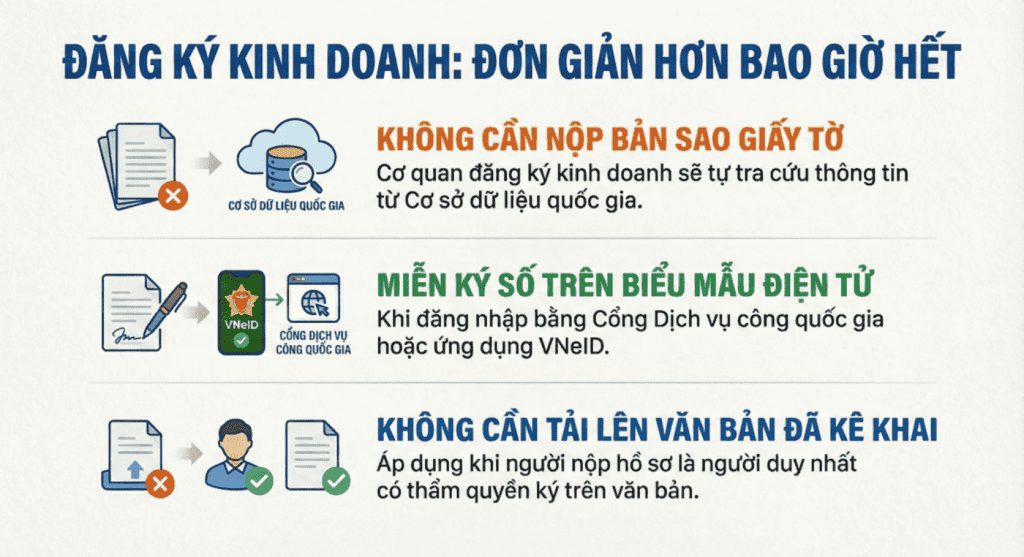 Thay vì yêu cầu người dân, doanh nghiệp phải chuẩn bị các bản sao giấy tờ pháp lý như trước, cơ quan đăng ký kinh doanh sẽ trực tiếp khai thác, sử dụng thông tin trong Cơ sở dữ liệu quốc gia về đăng ký doanh nghiệp để thay thế cho bản sao Giấy chứng nhận đăng ký doanh nghiệp, hợp tác xã hoặc hộ kinh doanh. Người dân, doanh nghiệp chỉ phải nộp bản sao các giấy tờ này trong trường hợp thông tin trên hệ thống không đầy đủ hoặc không chính xác.
