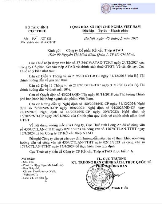 Công văn số 95/CT-CS ngày 10/3/2025 của Cục Thuế về chính sách thuế GTGT ThuevaCuocsong.vn Thứ Tư, 12/03/2025 Thời gian đọc: < 1 phút Nguồn: https://www.gdt.gov.vn Tagschính sách thuếchính sách thuế GTGTCông văn số 95/CT-CSthuế GTGT Bài trướcTP.HCM xây trung tâm tài chính rộng 9,2 ha tại đô thị mới Thủ ThiêmBài tiếp theoGia Lai: Vùng biên giới Đức Cơ giảm nghèo từ vốn tín dụng chính sách BÀI MỚI Thuế quan Mỹ có thể ‘cuốn phăng’ hàng tỷ USD xuất khẩu của ASEAN Thư kêu gọi, vận động ủng hộ đồng bào bị thiệt hại do bão số 10 Ngưỡng chịu thuế của hộ kinh doanh: Mức nào phù hợp? Bộ Tài chính hoàn thiện chính sách thuế bất động sản, vàng, casino Công văn số 3861/DON-QLDN1 của Thuế tỉnh Đồng Nai hướng dẫn về chính sách hóa đơn