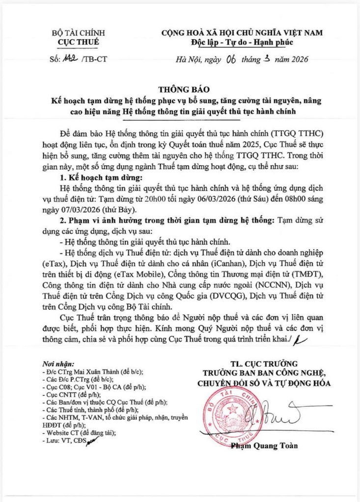 Cục Thuế – Bộ Tài chính vừa ban hành Thông báo số 142/TB-CT vế kế hoạch tạm dừng Hệ thống thông tin giải quyết thủ tục hành chính (TTHC), dịch vụ thuế điện tử từ 20:00 ngày 6/3/2026 (thứ 6) đến 8:00 ngày 7/3/2026 (thứ 7), nhằm tăng cường ổn định cho kỳ Quyết toán thuế năm 2025.