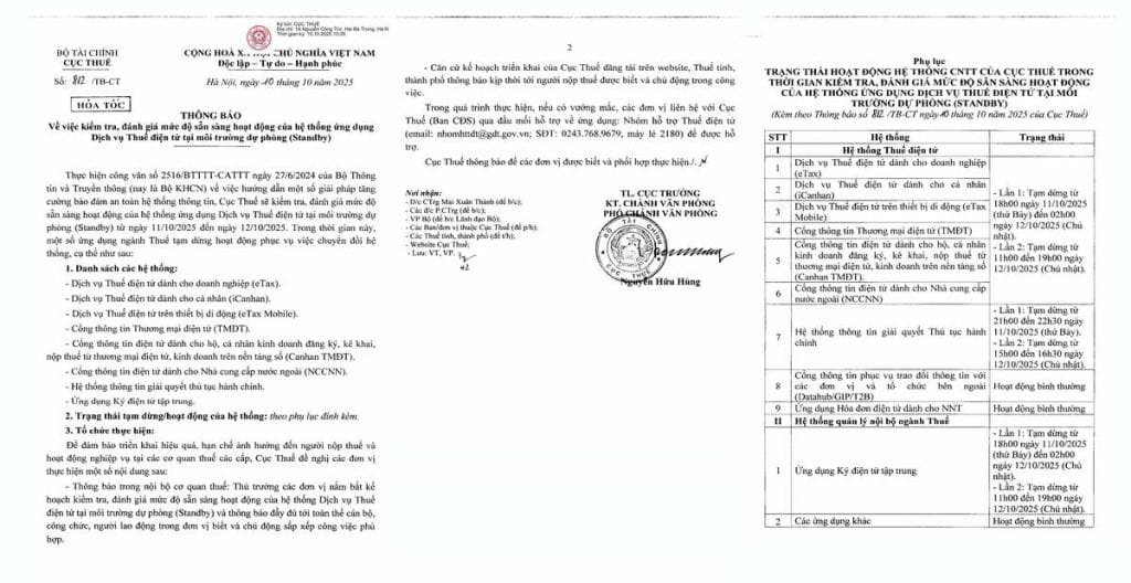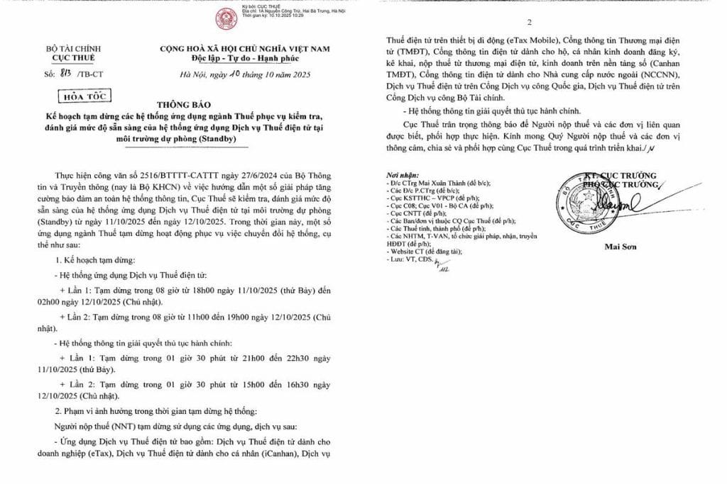 Ngày 10/10/2025, Cục Thuế (Bộ Tài chính) vừa phát đi 2 Thông báo số 812/TB-CT và 813/TB-CT gửi các cơ quan, đơn vị thuộc các bộ, ngành, người nộp thuế và cơ quan thuế các cấp để thông tin về kế hoạch tạm dừng các hệ thống ứng dụng ngành Thuế.