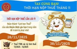 Infographic: Người nộp thuế cần chú ý về thời hạn nộp thuế trong tháng 11/2025Ngày 7/11, Thuế TP Hồ Chí Minh vừa thông báo đến người nộp thuế một số nội dung cần chú ý về thời hạn nộp thuế trong tháng 11/2025. Trường hợp có vướng mắc trong quá trình thực hiện, đề nghị người nộp thuế liên hệ với cơ quan thuế quản lý trực tiếp để được hướng dẫn, hỗ trợ kịp thời.