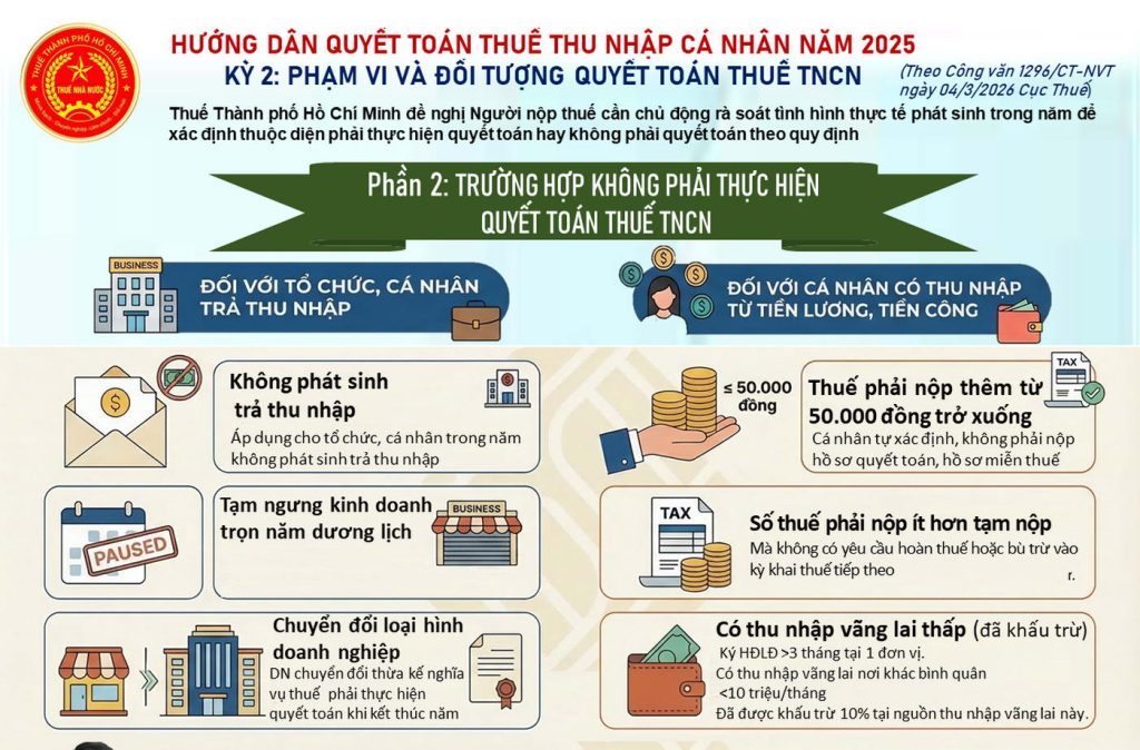 Infographic: Hướng dẫn quyết toán thuế TNCN đối với thu nhập từ tiền lương, tiền côngThuế TP Hồ Chí Minh hướng dẫn quyết toán thuế thu nhập cá nhân (TNCN) năm 2025 đối với thu nhập từ tiền lương, tiền công theo Công văn số 1296/CT-NVT ngày 4/3/2026 của Cục Thuế - Bộ Tài chính.