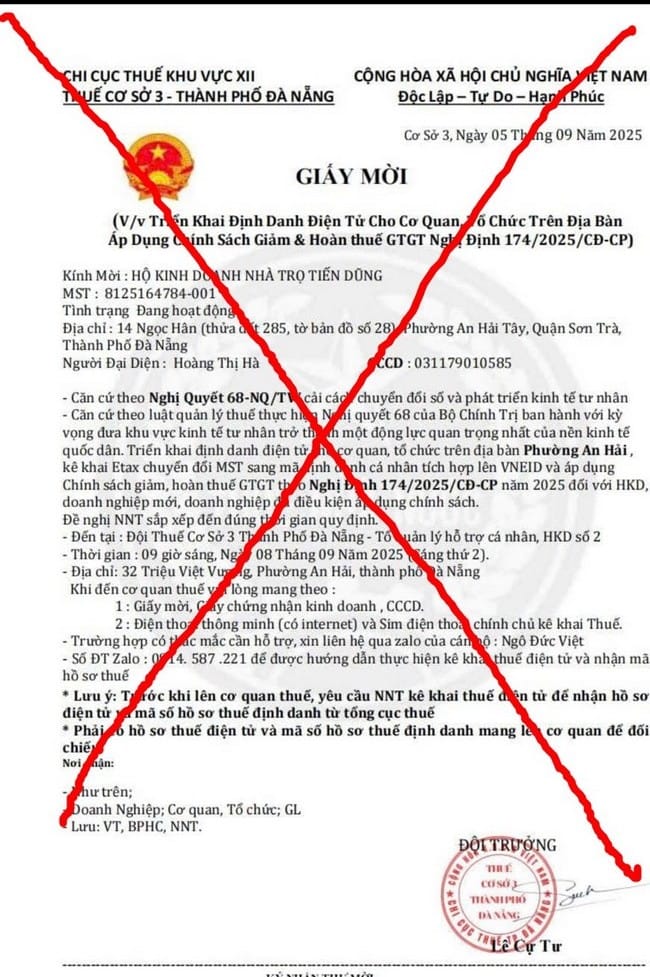 Thuế TP Đà Nẵng vừa cho biết, qua phản ảnh của người dân, doanh nghiệp trên địa bàn, có một số đối tượng mạo danh cơ quan thuế để kết nối, liên hệ gửi Giấy mời “Triển khai định danh điện tử cho cơ quan, tổ chức trên địa bàn áp dụng chính sách giảm và hoàn thuế GTGT Nghị định 174/2025” cũng như mời tập huấn, hướng dẫn chính sách thuế…