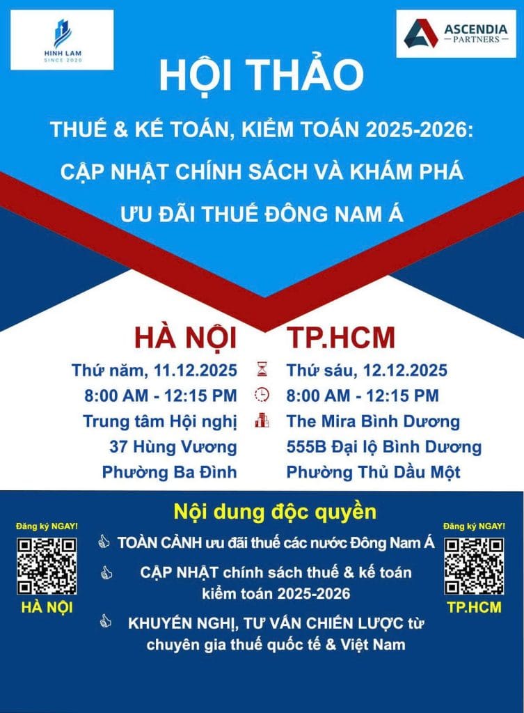 Đây là hội thảo chuyên đề thuế, kế toán, kiểm toán trong nước và quốc tế do Công ty TNHH Dịch vụ Tư vấn thuế Hinh Lam tổ chức. Sự kiện sẽ diễn ra trong 2 ngày tại Hà Nội (thứ năm, ngày 11/12/2025) và tại TP.HCM (thứ sáu, ngày 12/12/2025).