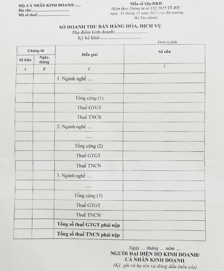 Trường hợp hộ kinh doanh, cá nhân kinh doanh có nhiều nhóm ngành nghề khác nhau thì sổ này có thể mở cho từng ngành nghề có cùng tỷ lệ % để tính thuế GTGT hoặc cùng mức thuế suất để tính thuế TNCN.