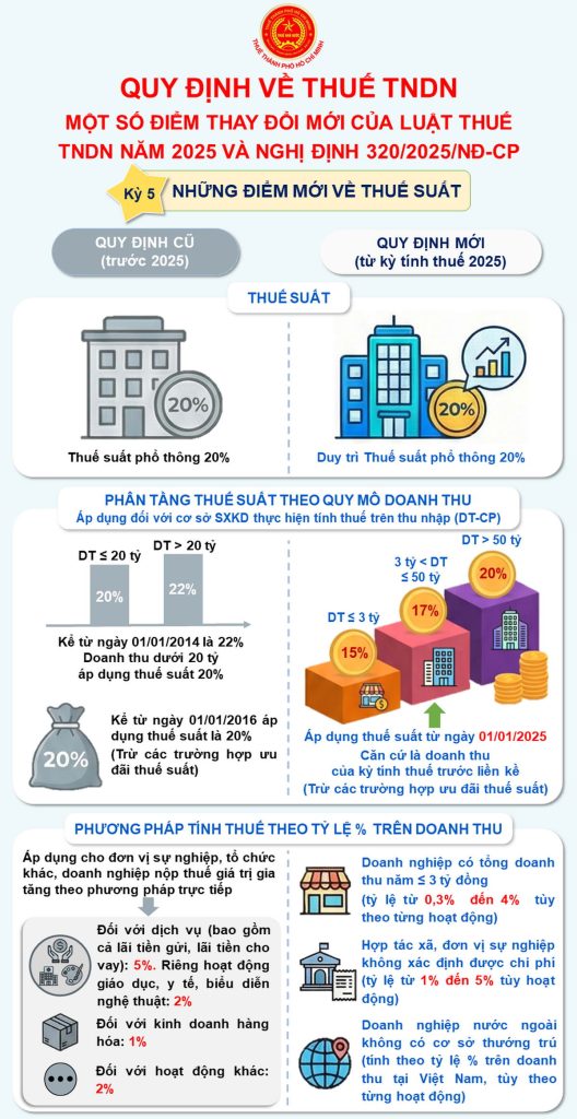 Thuế TP.HCM lưu ý về một số điểm thay đổi mới của Luật thuế thu nhập doanh nghiệp (TNDN) 2025 của Quốc hội và Nghị định 320/2025/NĐ-CP của Chính phủ quy định những điểm mới về thuế suất.