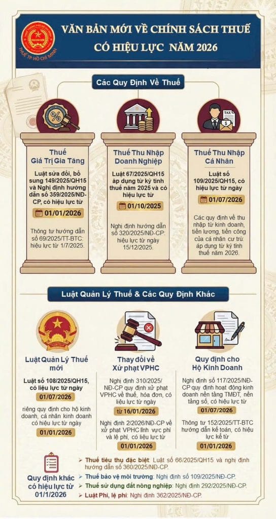 Ngày 14/1/2026, Thuế TP. Hồ Chí Minh vừa giới thiệu đến người nộp thuế một số văn bản mới về chính sách thuế có hiệu lực trong năm 2026.