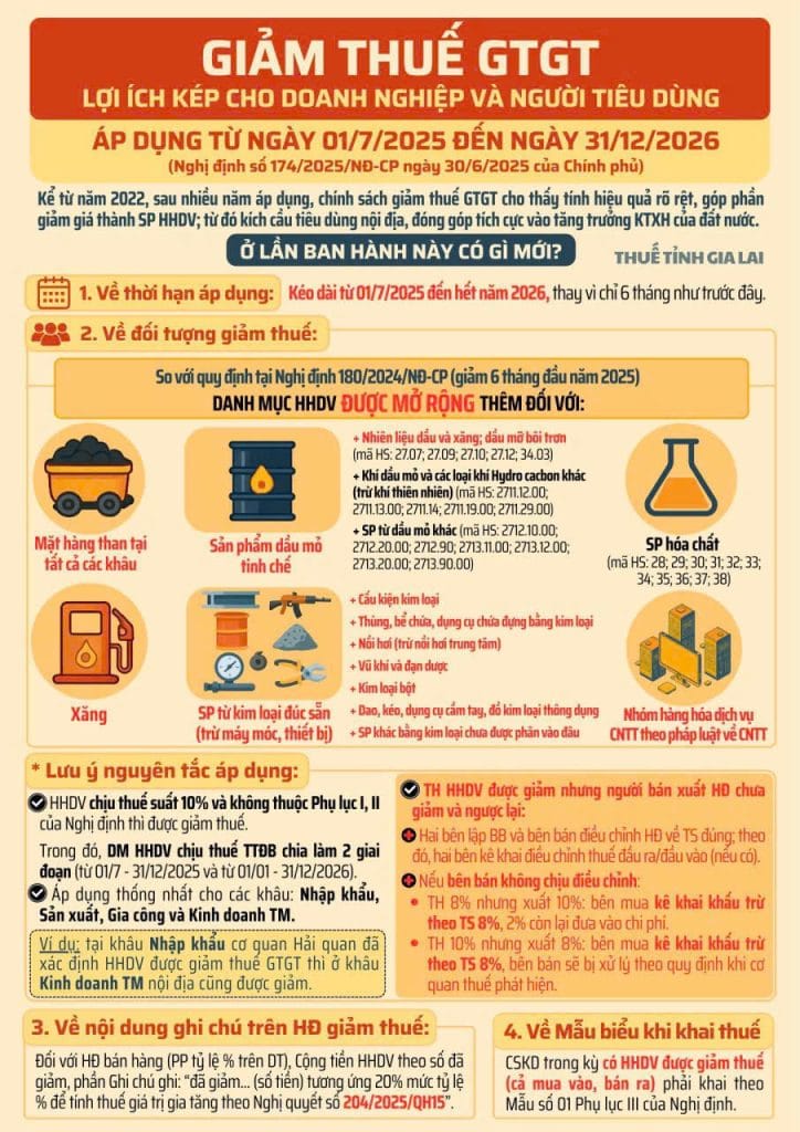 Infographic: Thông tin giảm thuế GTGT – lợi ích kép cho doanh nghiệp và người tiêu dùng ThuevaCuocsong.vn Thứ Hai, 14/07/2025 Thời gian đọc: < 1 phút Thuế tỉnh Gia Lai vừa có thông tin về việc giảm thuế GTGT – lợi ích kép cho doanh nghiệp và người tiêu dùng. Nguồn: Thuế tỉnh Gia Lai Bài trướcThực hiện đầy đủ nghĩa vụ thuế là con đường duy nhất để kinh doanh bền vữngBài tiếp theoBộ Tài chính: Dự kiến 14 loại thu nhập được miễn thuế BÀI MỚI Bán đất hơn 10 năm nhưng vẫn bị báo… nợ thuế Thuế quan Mỹ có thể ‘cuốn phăng’ hàng tỷ USD xuất khẩu của ASEAN Thư kêu gọi, vận động ủng hộ đồng bào bị thiệt hại do bão số 10 Ngưỡng chịu thuế của hộ kinh doanh: Mức nào phù hợp? Bộ Tài chính hoàn thiện chính sách thuế bất động sản, vàng, casino