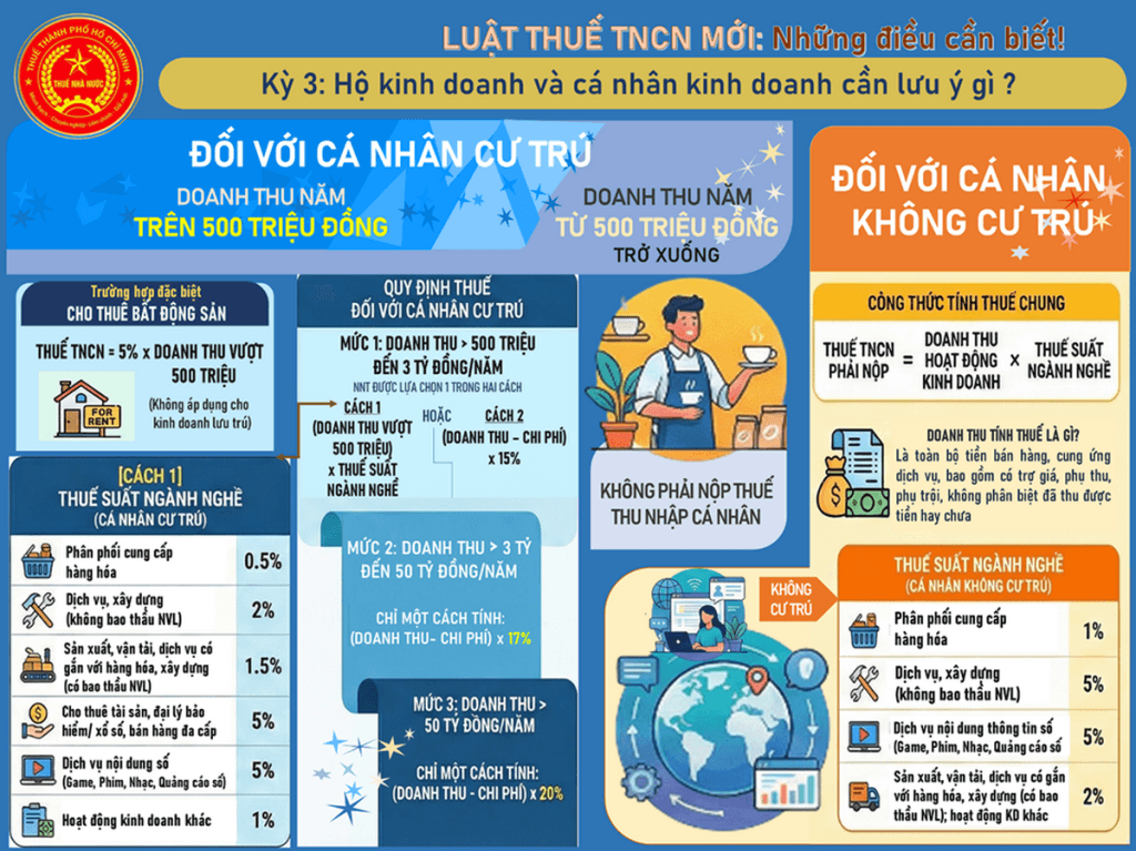 Đối với cá nhân cư trú, các hộ kinh doanh (HKD) và cá nhân kinh doanh cần chú ý: Mức doanh thu năm từ 500 triệu đồng trở xuống không phải nộp thuế thu nhập cá nhân (TNCN)…