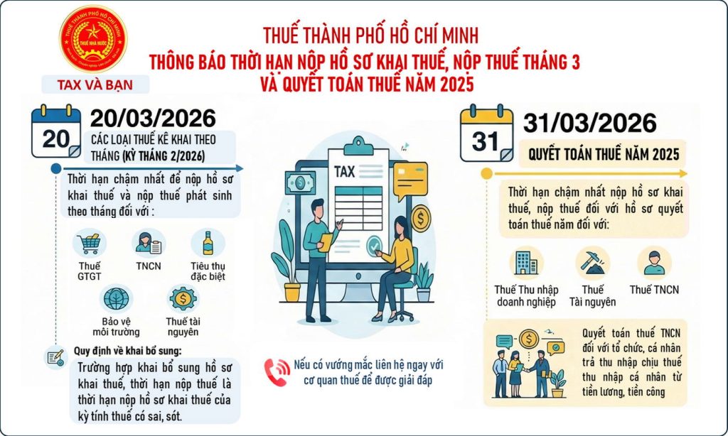 Thuế TP.HCM vừa có thông báo đến người nộp thuế về thời hạn nộp hồ sơ khai thuế, nộp thuế tháng 3/2026 và quyết toán thuế năm 2025.