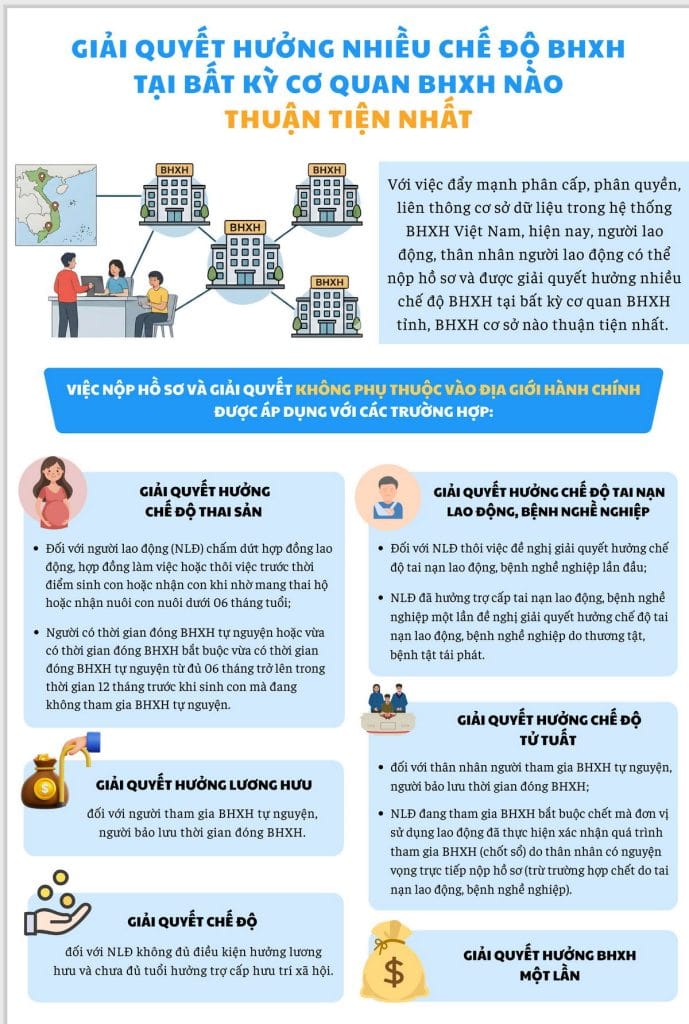 Với việc đẩy mạnh phân cấp, phân quyền, liên thông cơ sở dữ liệu trong hệ thống Bảo hiểm Xã hội (BHXH) Việt Nam, người lao động, thân nhân người lao động hiện nay có thể nộp hồ sơ và được giải quyết hưởng nhiều chế độ BHXH tại bất kỳ cơ quan BHXH tỉnh, BHXH cơ sở nào thuận tiện nhất.