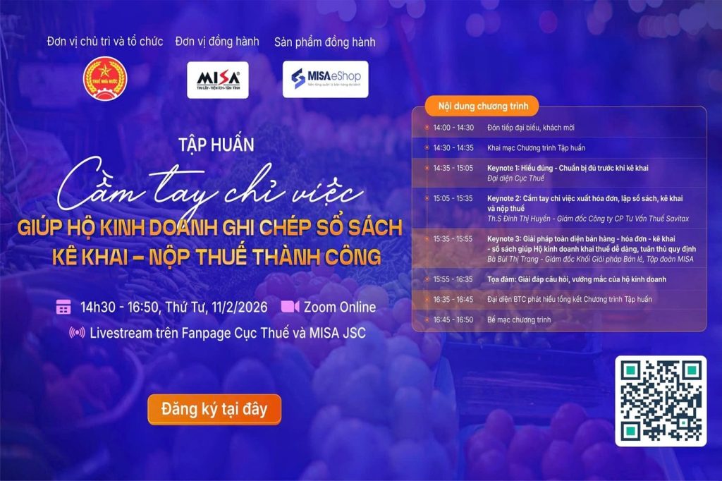 Trước những khoăn của bà con, vào 14h30’ đến 16h50’ chiều Thứ tư (11/02/2026) Cục Thuế phối hợp với Công ty Cổ phần MISA tổ chức buổi Tập huấn “Cầm tay chỉ việc” giúp hộ kinh doanh (HKD) ghi chép sổ sách – kê khai – nộp thuế thành công.