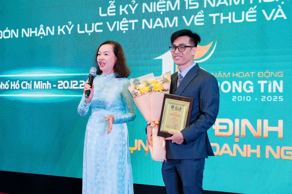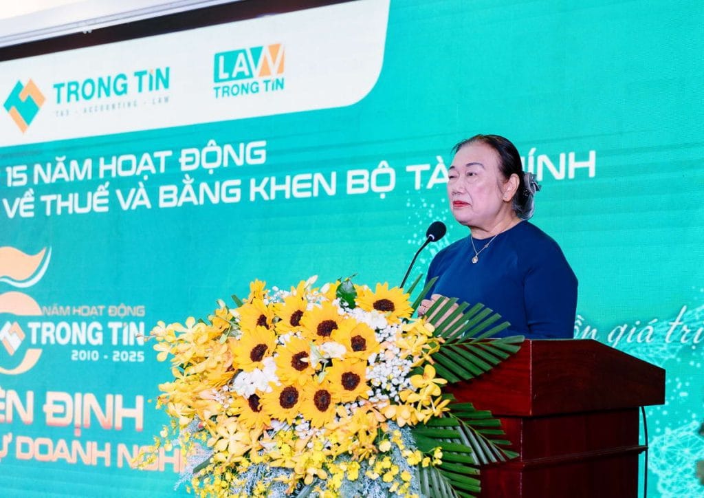 Bà Lê Thị Thu Hương – Chủ tịch Hội tư vấn và Đại lý thuế TP.HCM (HTCAA), nguyên Phó Cục trưởng Cục Thuế TP.HCM đại diện Hiệp hội Doanh nghiệp TP.HCM (HUBA) vinh danh Trọng Tín đạt danh hiệu “Dịch vụ kế toán, thuế tiêu biểu TP.HCM năm 2025”.