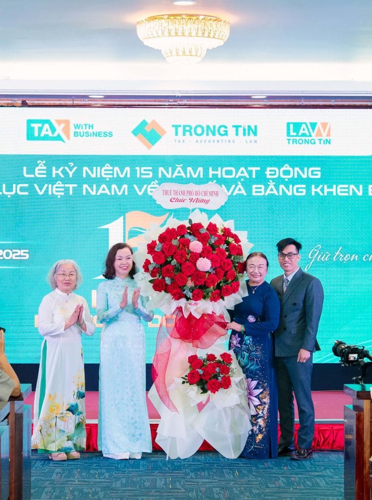 Ông Nguyễn Tiến Dũng – Phó trưởng Thuế TP.HCM chụp hình lưu niệm với tập thể Trọng Tín tại sự kiện và tặng hoa chúc mừng Lễ Kỷ niệm 15 năm hoạt động TaxTrongTin.