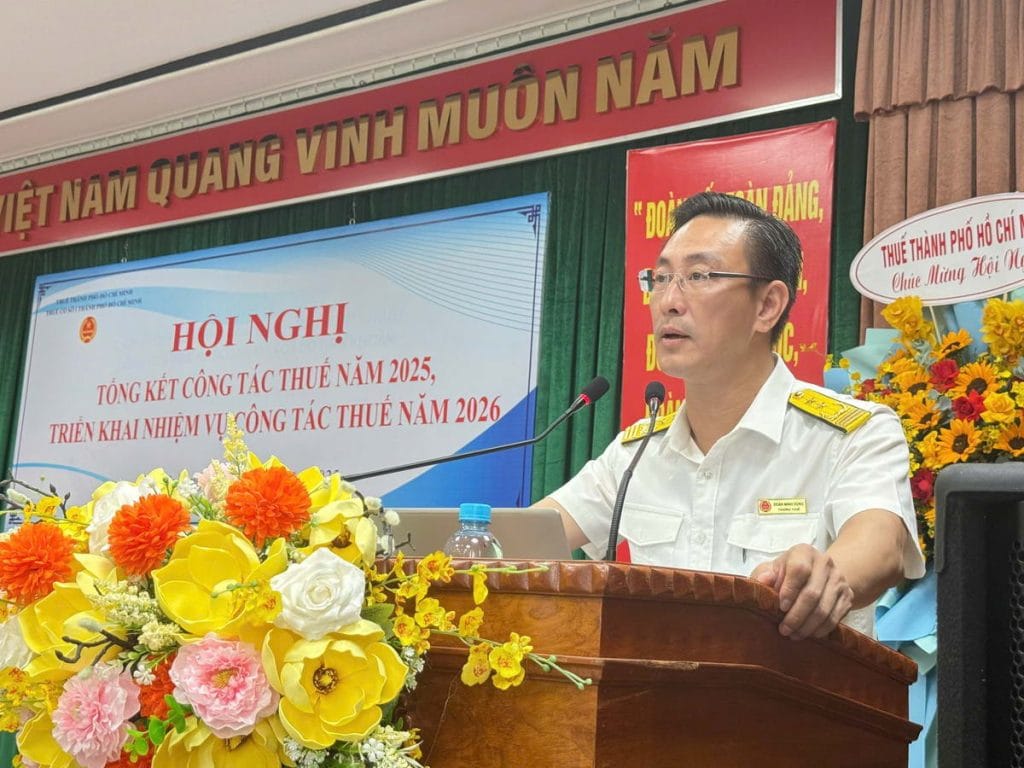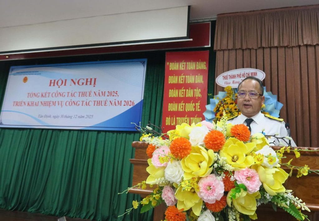 Trưởng Thuế TP.HCM Đoàn Minh Dũng phát biểu chỉ đạo tại Hội nghị Tổng kết công tác thuế năm 2025 và triển khai phương hướng, nhiệm vụ năm 2026 của Thuế cơ sở 1.
