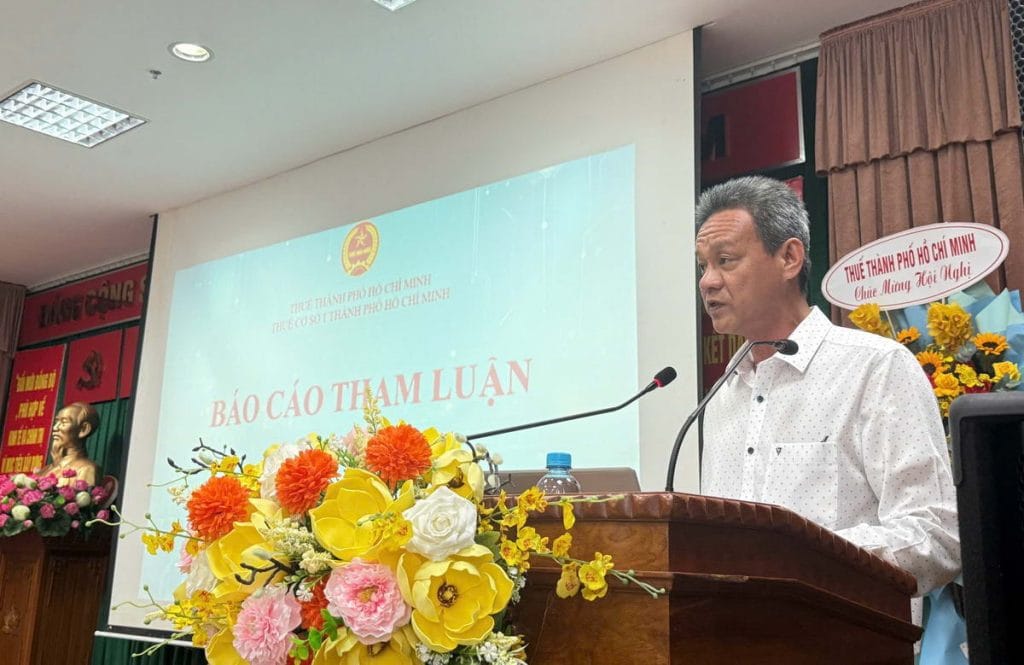 Đại diện lãnh đạo Phường Tân Định phát biểu tham luận tại Hội nghị Tổng kết công tác thuế năm 2025 và triển khai phương hướng, nhiệm vụ năm 2026.