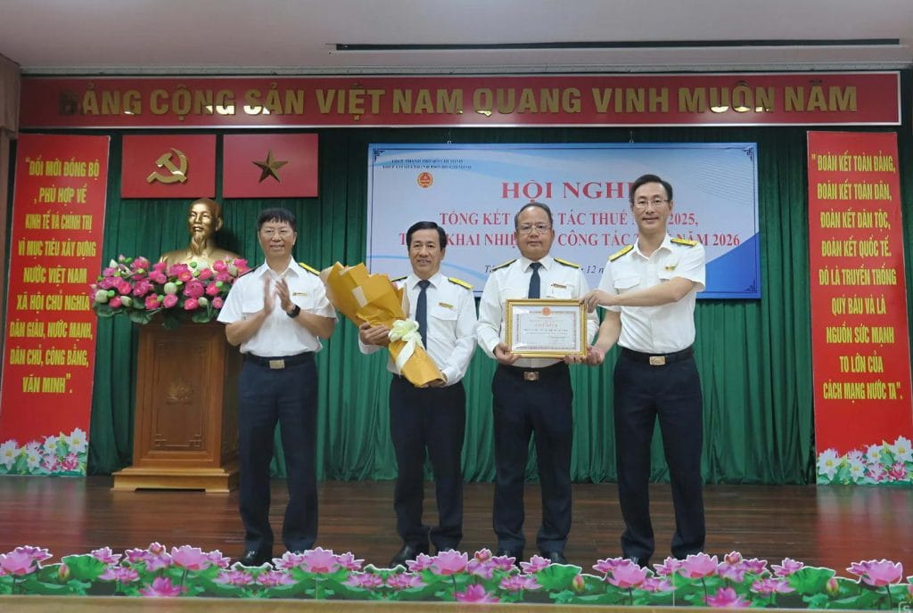 Ông Đoàn Minh Dũng – Trưởng Thuế TP.HCM (bìa phải), ông Trần Hiệp Hưng – Phó Trưởng Thuế TP.HCM (bìa trái) trao tặng Giấy khen hoàn thành xuất sắc công tác thuế năm 2025 cho tập thể Thuế Cơ sở 1 tại Hội nghị Tổng kết công tác thuế năm 2025.