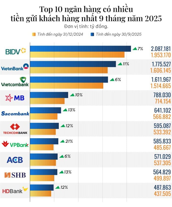 Top 10 ngân hàng có nhiều tiền gửi nhất trong 9 tháng đầu năm 2025