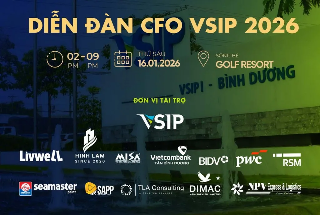 Diễn đàn CFO VSIP 2026 sẽ chính thức diễn ra chiều ngày 16/1/2026 (thời gian từ 14-21 giờ), tại Song Be Golf Resort, số 77 Đại lộ Bình Dương, phường Lái Thiêu, TP.HCM. Đây là Diễn đàn thường niên dành cho các chuyên viên tài chính, kế toán và nhà quản trị tài chính trong Khu công nghiệp VSIP và khu vực phía Nam.