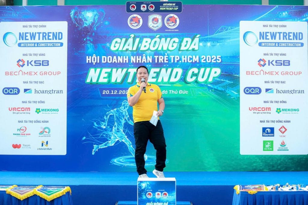 Ông Trần Hoài Nam phát biểu tại sự kiện – Đại diện Công ty TNHH Thương mại Dịch vụ Kỹ thuật Xây dựng Newtrend (chuyên thi công Trang trí nội thất và Xây dựng) – nhà tài trợ chính của giải đấu. Ban Tổ chức trân trọng cảm ơn những đóng góp quý báu của các Nhà tài trợ, những đơn vị đã góp phần quan trọng cho sự thành công của Giải bóng đá Hội Doanh nhân Trẻ TP.HCM 2025 – Newtrend Cup.